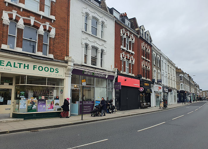 The property is situated on the southern side of Fulham Road, close to the junction with Pursers Cross Road. It thus forms part of a busy neighbourhood shopping centre serving the affluent resident population. Parsons Green Underground (District Line) is close by.